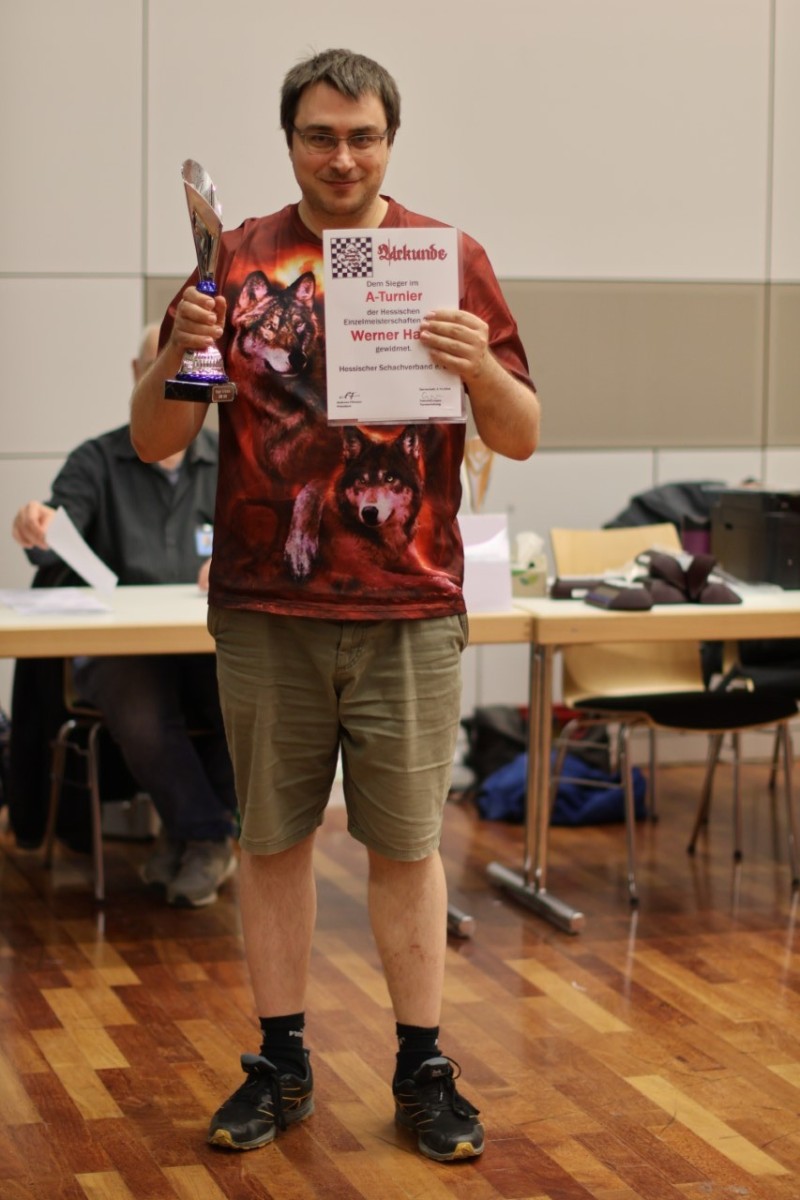 Im A-Turnier war es bis in die finale Runde ein offener Sechskampf um die ersten Plätze, worunter mit Jonas Tibke (Schachforum Darmstadt), Werner Hahn (SC Weiterstadt), Calvin Wenzel (SK Gernsheim) und Steffen Heß (SC Groß-Zimemrn) gleich vier Starkenburger noch Siegchancen hatten. Durchgesetzt hat sich am Ende Werner Hahn dank eines Sieges im direkten Duell mit Calvin Wenzel, während Tibke und Heß ihre Partien nur remisieren konnten. Dem Turniersieger, der es auf 5½ Punkte schaffte, folgten drei Spieler mit 5 Punkten.